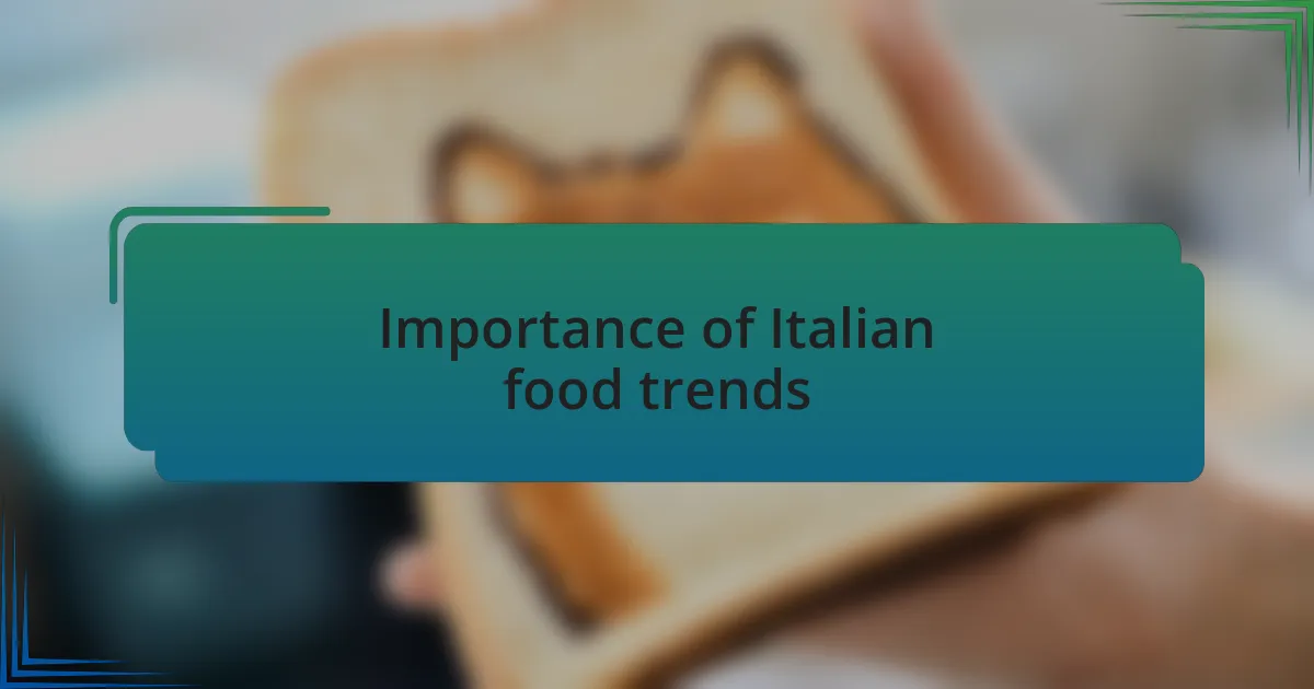 Keeping an eye on Italian food trends is crucial for staying relevant in our fast-paced culinary environment. I’ve often found that when I adapt my menu to include trending ingredients, like artisanal pasta made from ancient grains, the response is overwhelmingly positive. It makes me wonder, what if I hadn’t embraced these trends? Would my dishes have felt stale and disconnected from the desires of modern diners?